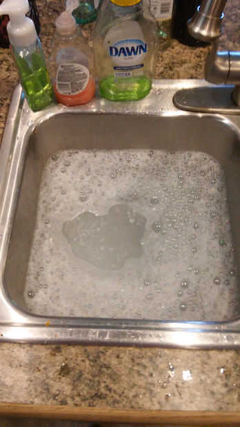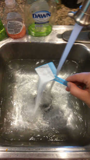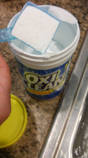 2. Añadir una cucharada de OxyClean en el fregadero de agua caliente - esto ayudará fácilmente a la hoja de etiquetas de