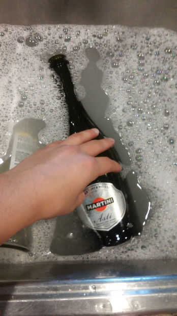 3. Agregue lentamente las botellas para el agua. -Hacer seguro de que las etiquetas estén completamente sumergidas en el agua