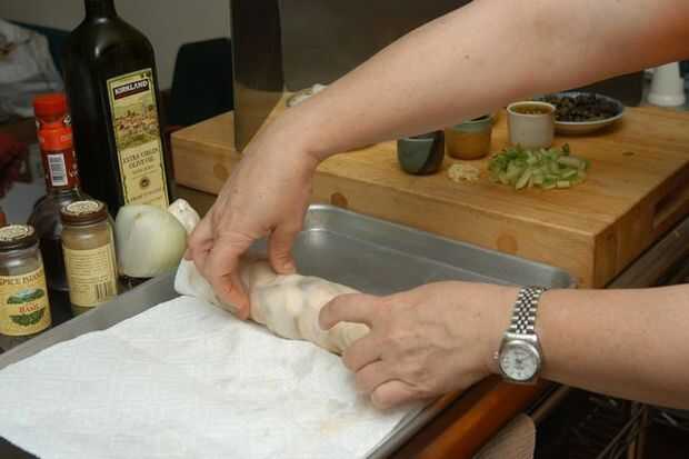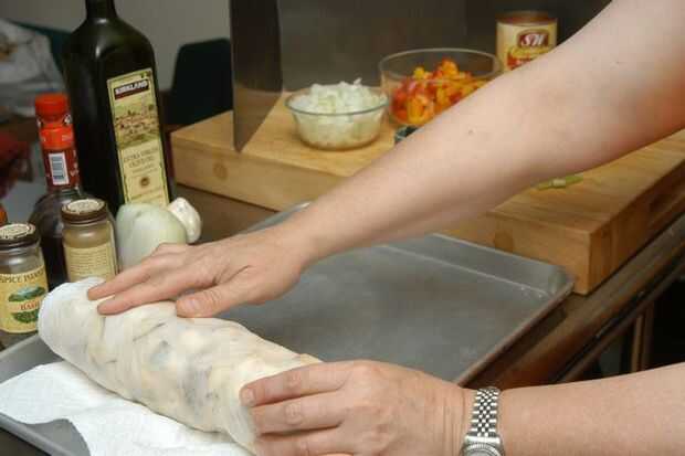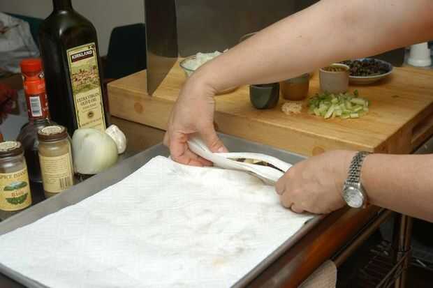 Cubierta de berenjena con toalla más presionar, enrollo y exprimir el agua y la sal tanto como usted puede. No ser suave, en esta etapa la berenjena es simplemente una esponja y la menos agua tiene en ella mejor! Se regordete para arriba otra vez y saturado con la exquisitez de todos los demás ingredientes.