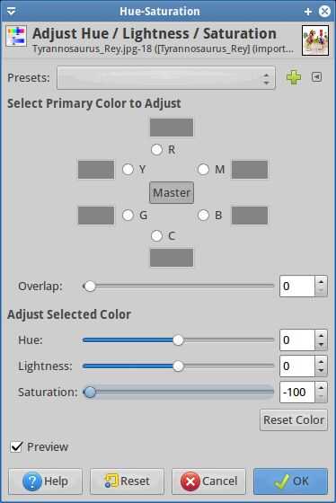 Con el cuadro de diálogo Hue-Saturation abrir, buscar el regulador saturación y arrástrelo hacia la izquierda. Esto elimina todo el color, haciendo que su imagen en escala de grises.