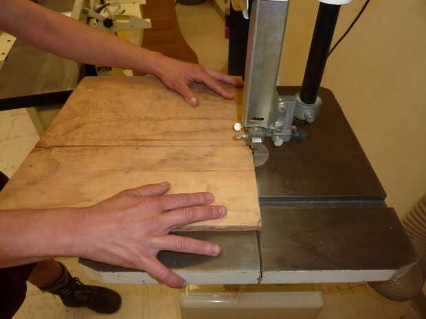 Con sierra vertical de cinta o sierra de mesa cortar a tamaño. Es mejor sobre-corte un poco entonces socavar como siempre se puede lijar abajo piezas a la perfección. Use anteojos de seguridad (no las gafas de sol en mis ojos) pero que en mi cara.