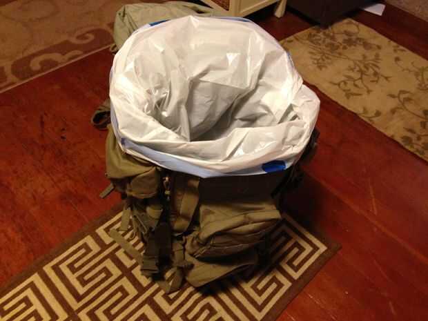 Asegurando que se utiliza todo el espacio de la mochila, doblar el borde de la bolsa alrededor del exterior de la unidad de acceso dentro de la maleta.  Esto protegerá tu equipo de lluvia y agua, así que cuanto más gruesa la bolsa de basura es, mejor.