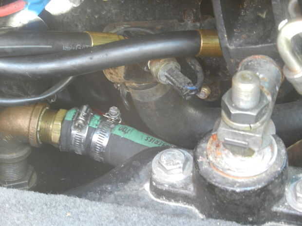 Levante el capó del motor y localice la manguera de refrigeración de agua. En este barco se encuentra en el lado del conductor del motor. Es la manguera negra con una guarnición de cobre amarillo y una franja verde.