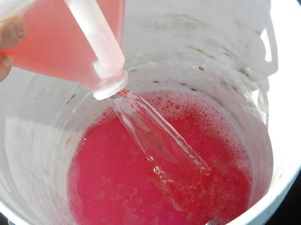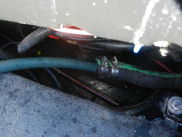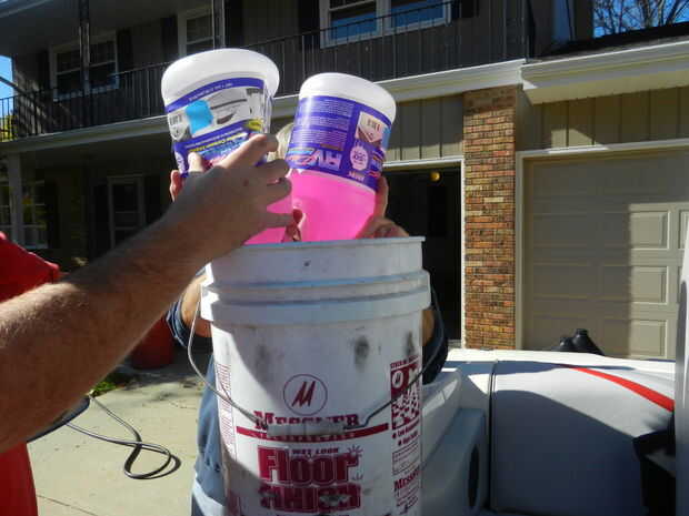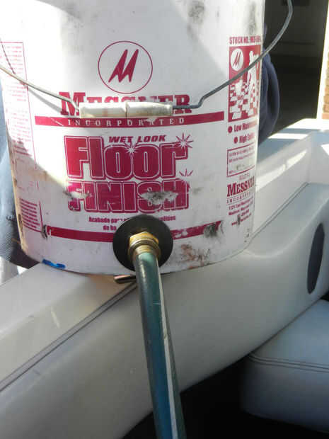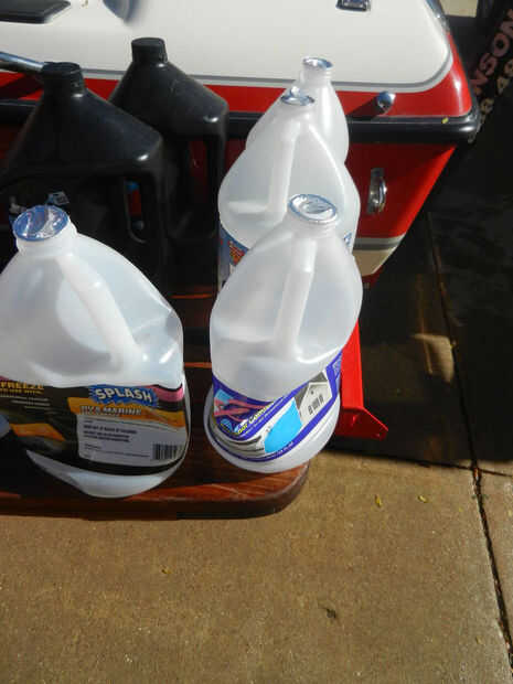 Continúe vertiendo anticongelante hasta que vierte hacia la parte posterior del barco. Luego apague el motor. Nuestro barco utiliza aproximadamente 4 botellas de anticongelante.