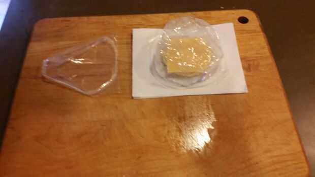 bocadillo. Coloque la envoltura de plástico de la burbuja sobre el combo de huevo, chorizo/queso para crear un horno de vapor pequeño que se ablande el queso mientras esperamos el mollete inglés terminar de tostar.