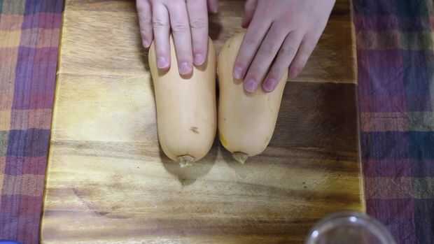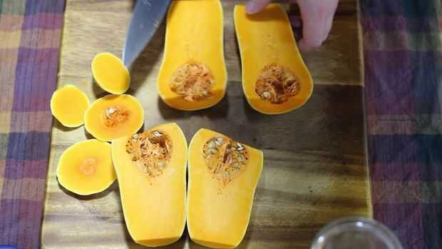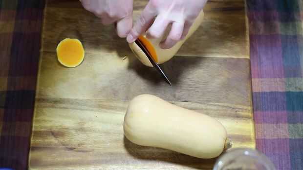 Tomar la calabaza y cortar el la parte superior e inferior, corte la parte inferior plana hará mucho más fácil y más seguro para gestionar al corte a través de la calabaza entera.