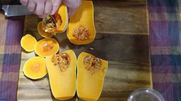 Una vez tu calabaza por la mitad, tome una cuchara y sacar la semilla y la parte carnosa teniéndolos en.