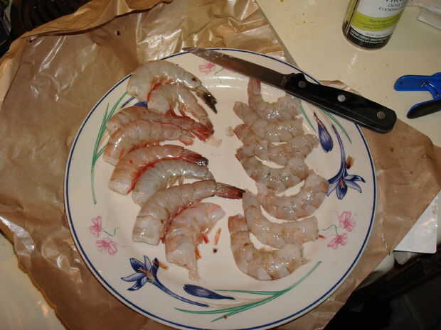 Paso 3: Pele y Desvene (hecha por corte abierto la parte posterior de los camarones y quitar el tracto intestinal) el 1/3 lb camarones. La izquierda es lo que debe buscar su camarón como fuera de la tienda, el derecho es lo deben como preparación.