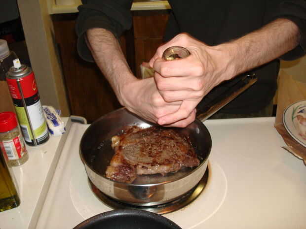 Paso 6: Añadir pimienta molida fresca, sal y 1 cucharada de mantequilla da vuelta cada 4-5 minutos como los cocineros slow filete (no olvide empujar los agujeros en la carne con un cuchillo para cocina uniformemente!)