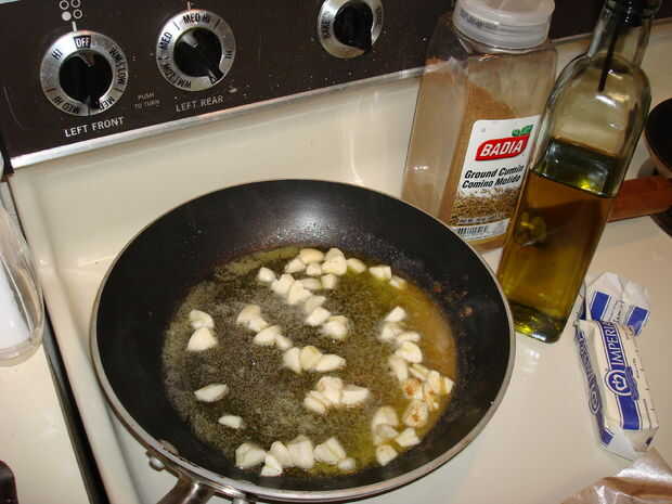 Paso 4: Mezclar 1 cucharada de mantequilla con 1 1/2 cucharada de aceite de oliva, 4 batidos de ajo y aderezo de hierbas y sólo una pizca pequeña de comino en tamaño medio pan en lo alto. después de que el aceite esté caliente añadir el ajo y reducir el calor a media baja.