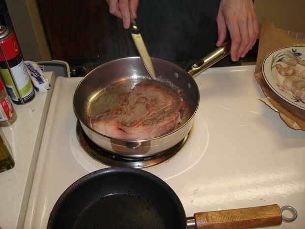 Paso 5: Mientras se cocina el ajo, en un recipiente aparte flash cocinar la parte exterior de la carne (temperatura alta, unos 30 segundos por cada lado), luego reducir el fuego a medio bajo.