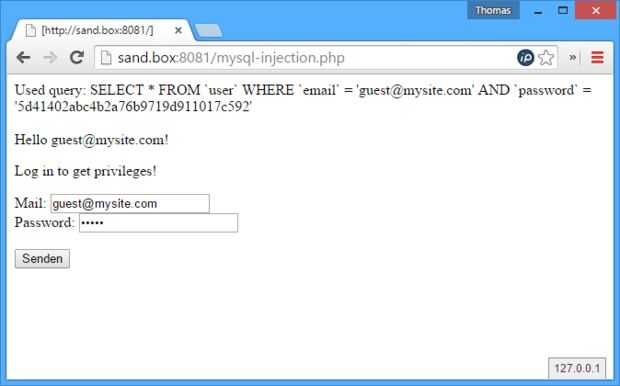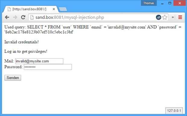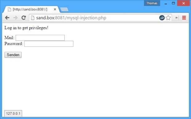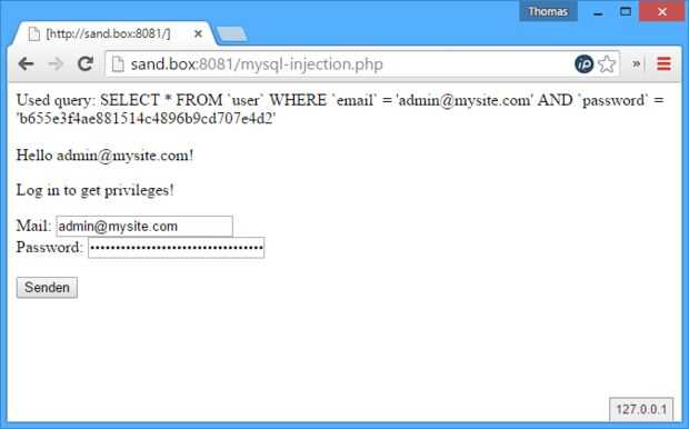 Para empezar, llamar el script en su navegador web. En mi caso la url es http://sand.box:8081/mysql-injection.php ya que encamina "sand.box" a "127.0.0.1". Usted puede llamar http://sand.box:8081/mysql-injection.php o http://sand.box:8081/mysql-injection.php para que funcione.