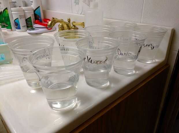 Etiqueta de un vaso de plástico para cada acuario. Llene cada vaso con aproximadamente 2 pulgadas de agua.