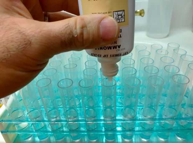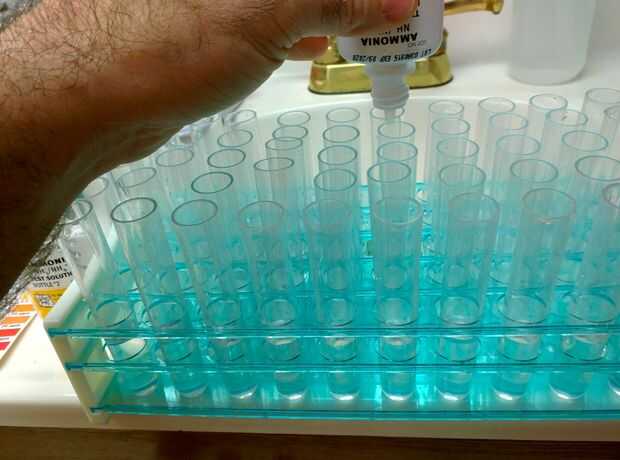 • Añadir 8 gotas de la botella de amoniaco 1 en todos los tubos en columna uno y columna. A continuación agregue 8 gotas de la botella de amoniaco 2 al todos los tubos en columna uno y columna.