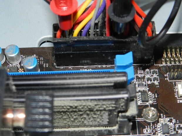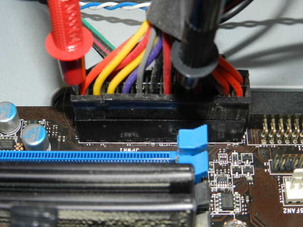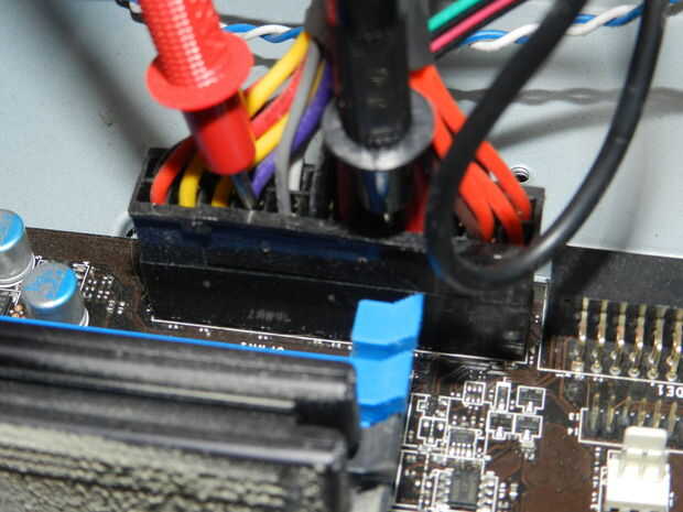 Ahora a la P1 20 (10 x 2) clavija de prueba desea deslizar la punta de prueba negra a uno de negro (tierra) los cables en la parte posterior de la P1 enchufe mientras aún está conectado. Asegúrese de que va hacia abajo lo suficiente para hacer contacto. Una vez que la tierra esté en su lugar, puede dejar allí mientras probamos los otros alambres. Empezar por probar el cable naranja, colocando la punta de prueba roja en la parte posterior del enchufe P1 Dónde está el cable naranja. Puesto que el cable naranja es un alambre de 3.3 voltios debe leer en algún lugar entre 3,0 voltios y de voltios 3,63. Ahora prueba el cable azul quitando la sonda roja del cable naranja y deslizándola en el conector P1 Dónde está el cable azul. El cable azul es un cable (negativo)-12 voltios y debe leer en algún lugar entre-10.8 voltios a-13.2 voltios. Luego coloque la sonda roja en el cable rojo. Una vez más ya que es un cable rojo, es un cable de 5 voltios y debe leer en algún lugar en el rango de 4.5 a 5.5 volts. Ahora retire la sonda roja del cable rojo y conectarlo al cable amarillo. El cable amarillo es un cable de 12 voltios y se debe leer en algún lugar entre 10,8 v y 13,2 voltios. Una vez que haya terminado de quitar la prueba las puntas de prueba de la P1 Conecte y apague el medidor. Luego apagar la alimentación utilizando el interruptor en la parte posterior de la fuente de alimentación girándolo a la posición de apagado y no te olvides de desenchufar el conector P1 de la placa base. En este punto, si han determinado que la fuente de alimentación no funciona tienes que reemplazarlo. Si la fuente de alimentación sigue siendo buena, que tendrá que volver a conectar todo y asegurarse de que las botas de computadora hasta bien y todavía funciona.