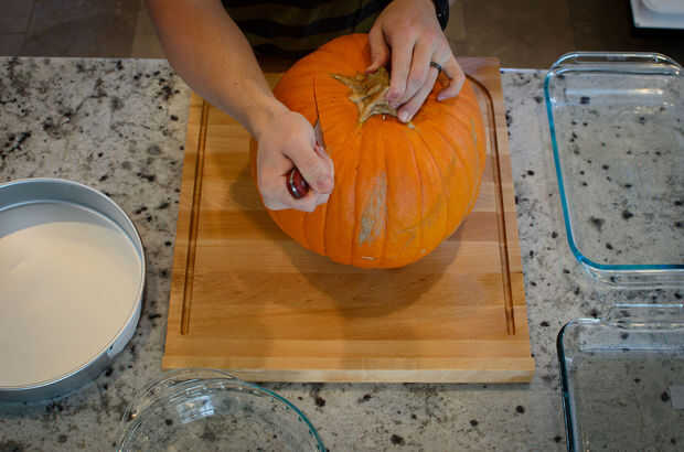 Con el mismo método, puede hornear natillas u otro pudding (en una calabaza).Paso 1: Hornear la calabaza 1 calabaza pequeña sobre 1 kg1/2 cucharadita de canela en polvo y una pizca o dosCortar la parte superior de la calabaza como se muestra y limpia