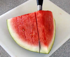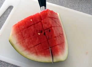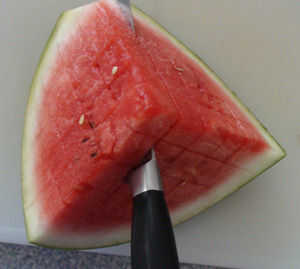 Tomar el cuchillo y cortar líneas diagonalmente la sandía como en la primera foto.