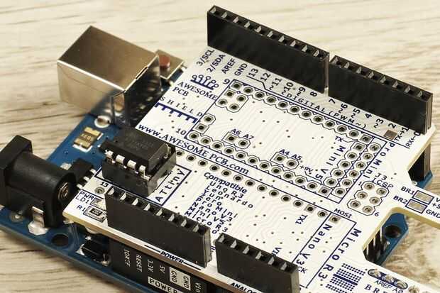 2. poner el ArduShield en el Arduino Uno y presione suavemente hasta el punto donde se detenga.