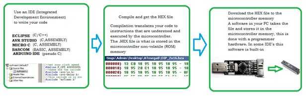 -Compaling y la creación de una. Archivo hexadecimal: compilación traduce su código de instrucciones que son entendidas por el microcontrolador. Estas instrucciones están en el .hex que archivo y este archivo va a ser almacenado en la memoria ROM del microcontrolador