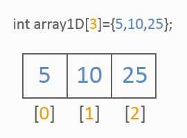 array1D [2] y esto sería igual a 25. Observe el tamaño de la matriz es 3 pero el último elemento tiene un índice de 2 porque los índices de matriz empiezan en 0. Y por supuesto usted puede tener otros arreglos de tipo como caracteres Char es muy útil como una matriz, porque lo que tienes entonces es una palabra o un mensaje.
