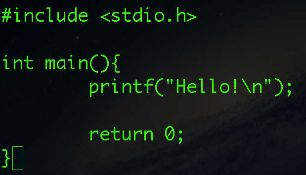 La línea printf() en el código es lo que se denomina una llamada de función. Esto es lo que parece cuando se utiliza una función que es independiente de su función principal, ya sea que usted escribió o alguien escribió en una biblioteca. En este caso printf() es una función de la biblioteca stdio y puede manejar un montón de diferentes argumentos entre los paréntesis. "Hola! \n" como los resultados de la discusión en printf() Mostrar en la pantalla Hello!