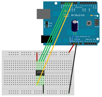 - conecta tu Arduino (previamente programado como un ISP) a su ATtiny85 - gomas seu Arduino (programado como um ISP) no seu ATtiny85: