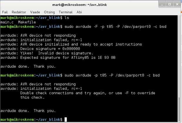 $ sudo avrdude -p t85 -P/dev/parport0 - c bsd
