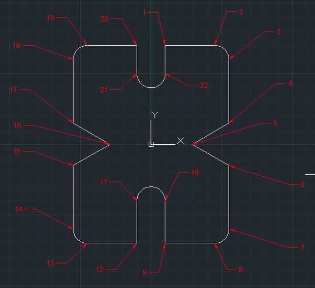 Puntos se definen como lugares donde se produce un cambio en la traducción. Por ejemplo, sería un punto donde un movimiento de la dirección de x cambia a un movimiento y de la dirección o la comienzo y extremos de un arco. En la parte que presento, hay un total de 22 puntos. Cada punto tiene un conjunto único de coordenadas que se traducirá en movimiento mediante código de g. Ordenar los puntos en última instancia va a determinar la estructura de su programa. Para este ejemplo, va ser iniciando mi corte en el punto 1 y continuar en sentido horario alrededor de la parte.