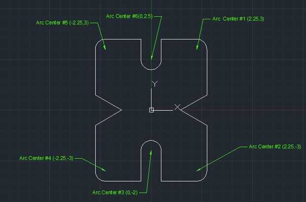 Encontrar los centros de arco se puede derivar la el dibujo técnico suministra. Hay un total de 6 arcos en la parte. Los centros de arco son esenciales para encontrar los puntos inicial y final de los arcos y los y las J variables.