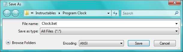 2. Guarde el programa como Clock.bat. El ".bat" le dice a la computadora qué lenguaje de programación que utiliza