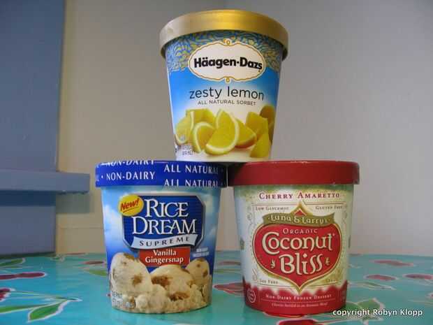 Reemplazar con: sorbete, granizado, soja helados, helado de coco, barras de fruta etc.. Toneladas de opciones aquí, incluso en cadenas de importantes supermercados, chequeen la sección de congelados. Una vez más, helado de coco reina debido al contenido de grasa.