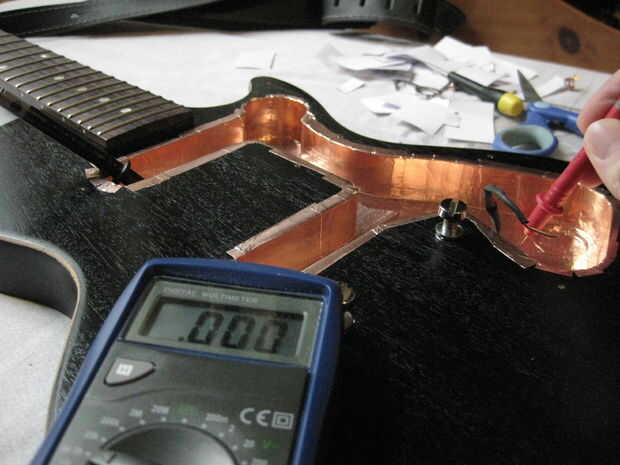 Asesino truco n ° 3: Si la resistencia no es homogénea en la cavidad principal (pastillas, botes...), cortar dos rayas largas y delgadas de adhesivo (aproximadamente 1cm de ancho). Uno debe ser puesto en el eje del cuello, desde el cuello (no te preocupes, el golpeador lo cubrirá) al extremo más alejado de la cavidad
