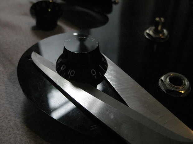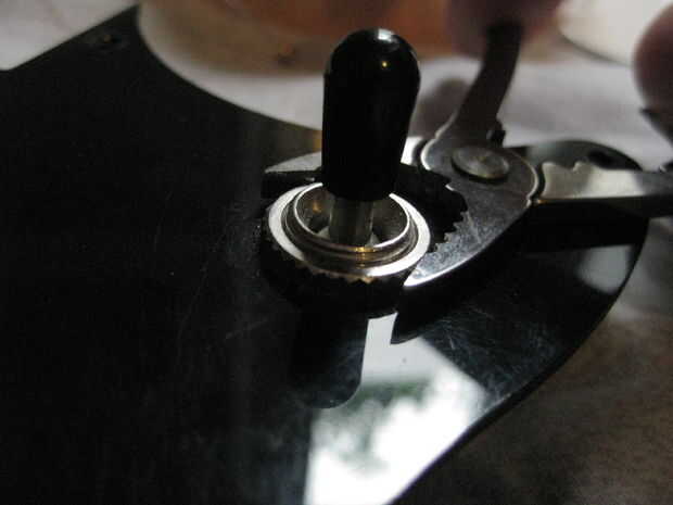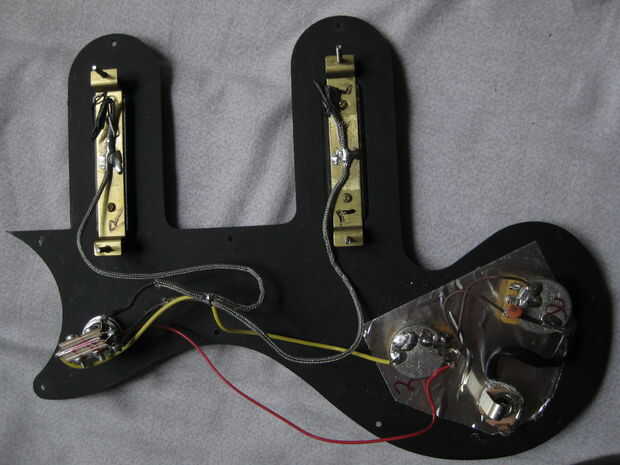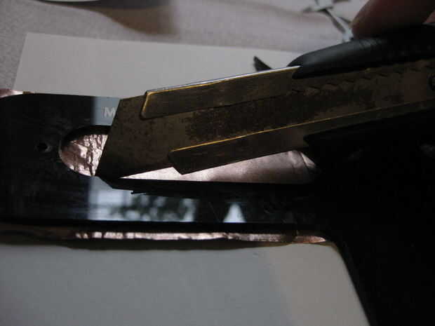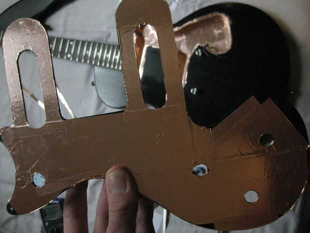 Cubrir la espalda del golpeador con el adhesivo, luego cortar los agujeros para pickups, botes, tornillos... con un cuchillo del exacto.