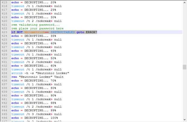 Abra el archivo por lotes. (USB carpeta Locker.bat) con notepad ++ y a la línea #421 y verá esta línea de código "si no % biométrico == INSTRUCTABLES goto ERROR7" cambiar INSTRUCTABLES en la contraseña deseada. Tenga en cuenta que la contraseña por defecto de USB carpeta Locker es INSTRUCTABLES es todo en mayúsculas y minúsculas. Después de guarde el archivo y proceder al siguiente paso!