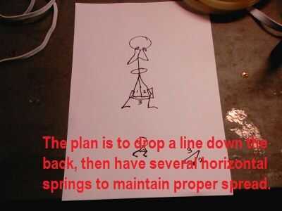 El plan es bajar una estructura rígida de la espalda. Esta estructura apoya los resortes que se adhieren a las rodillas. Originalmente considerado tres manantiales y dos hicieron el truco (siempre simplificar).