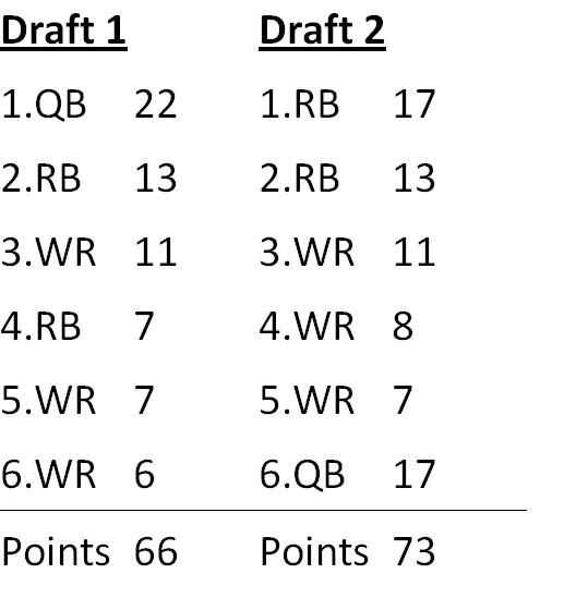 Proyecto 1: Analizando puntuación general decide tomar un mariscal de campo con su primera opción. Suponiendo que este Mariscal de campo pone los puntos más altos de cualquier Mariscal de campo durante todo el año será alrededor de 22 puntos a la semana. Continuar a tomar posiciones que usted necesita y toma respectivamente un RB, WR, RB, WR, WR en rondas de dos a seis. Tomando los números promedio de las gráficas y poner en la hoja de cálculo que se muestra a continuación usted puede ver que estas primeras seis selecciones utilizando la estrategia de un proyecto usted conseguirá 66 puntos por semana.