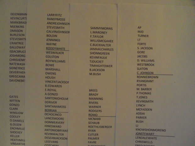 Me gusta redactar cinco corredores, seis receptores abiertos, dos mariscales de campo y un extremo apretado, golpeador y defensa en equipo. Tener mucha profundidad en las posiciones de corredor y receptor ancho da su equipo un montón de opciones durante semanas bye.