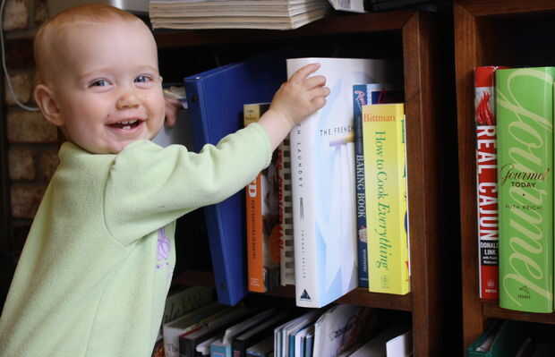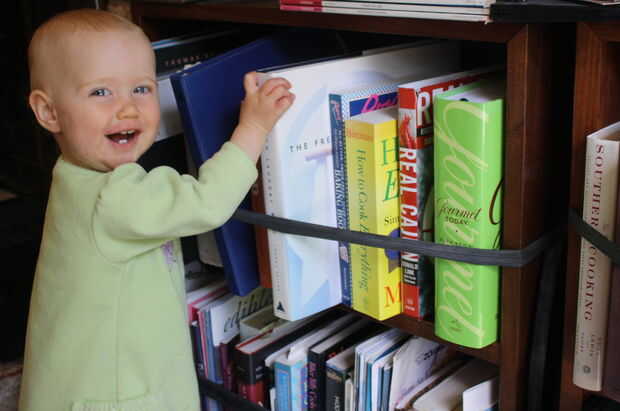 en la cocina, tenemos una serie de bajo estantes llenos de libros de cocina.  Nuestro bebé encuentra nada organizado irresistible y le encanta sacar los libros fuera de la plataforma.  Más allá de crear entropía innecesario como desempaqueta los libros, algunos de ellos son bastante grandes y pueden aplastar un dedo.  Por lo tanto, yo niño prueba de los libros en lugar de antigua bicicleta innertubes.