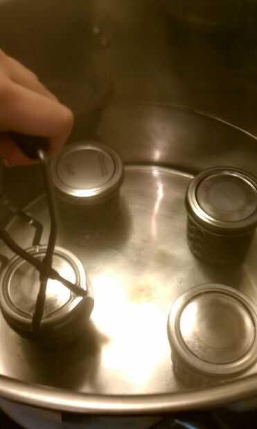 Una vez las tapas (tapa + banda = tapón) en sus frascos, lugar nuevamente en la olla o cacerola con agua hirviendo. Usted puede colocar tantos frascos como quepan, pero no masificarlos. Vuelva a colocar la tapa de la olla o cacerola y ajustar el calor medio alto. Cuando el agua retorna a la caldera, iniciar el temporizador.
