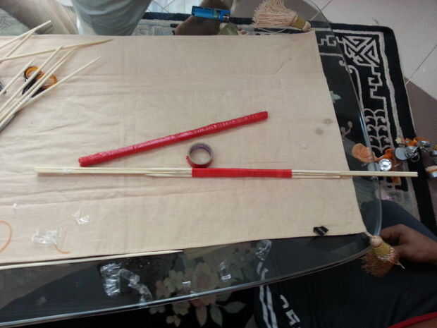 7 tomar palos de madera y sujetarlos con cinta de goma.  Intente que sea gruesa.