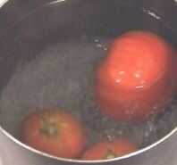 Llene su olla grande con agua y llevar a ebullición. Luego coloque unos tomates (4 o 5) en el agua a la vez. Iniciar el temporizador y dejarlas durante unos 45 segundos. Entonces, inmediatamente transferir sobre a un bol de agua helada. Después de que hayan enfriado (pocos segundos), las pieles se deslizarán fuera.