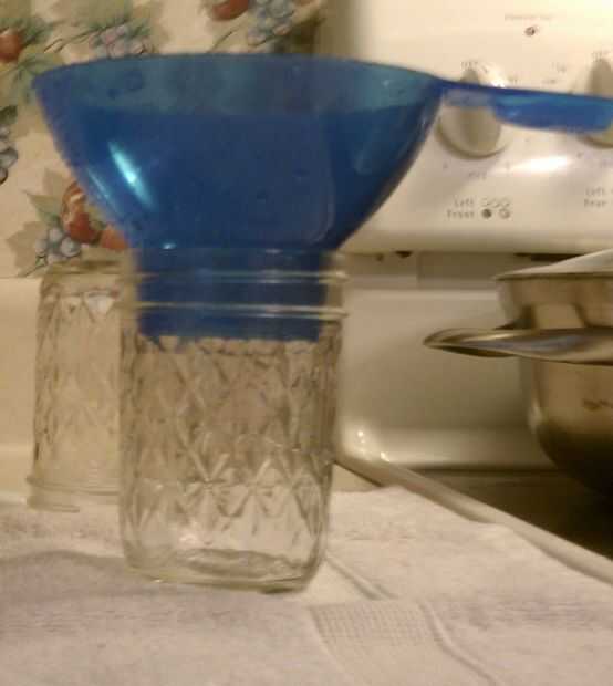 Una vez que la salsa esté caliente, retirar sus frascos del baño lavaplatos o agua y colóquelos sobre una toalla. Inmediatamente llenar sus tarros a espacio libre de 1/4 de pulgada (usando una herramienta de espacio de cabeza o cinta de medir).