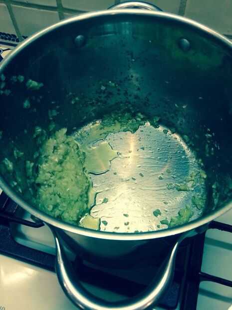 Paso 4 - en una salsa más pequeño pan picar y saltear tres cebollas y 3 bulbos de ajo en aceite de oliva.