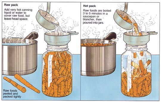 Si tienes uno de estos embudos swank que se adapta a tus frascos, acabo más fácil tu vida. Dificulta mucho derrame comida en el borde de la jarra. "Espacio de cabeza" es el espacio en la parte superior de la jarra. El USDA dice que el método «embalaje caliente» se muestra aquí es mejor porque quita más aire de los alimentos.