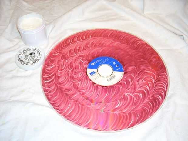 Coloque la toalla sobre una superficie plana y coloque el disco sobre la toalla. Abrir el tarro de madre y limpiar un poco hacia fuera con la punta de los dedos (lavarse las manos antes de iniciar este proceso justo?). Empezar a trabajar el compuesto sobre el disco usando pequeños movimientos circulares como si se lava un coche. Las uñas largas obviamente no son propicias para esta tarea. Utilice una ligera presión como haces esto. Usted quiere tener suficiente compuesto para que sea fácil de trabajar pero no espuma en el disco. Su forma alrededor del disco de trabajo. Es muy importante que use pulido movimientos circulares y no de lado a lado. Déjelo secar por unos minutos y luego tome una de las toallas de tela de toalla y empezar a pulir. Una vez más use pequeños movimientos circulares. Una vez que has logrado una nube nublada todo el movimiento del disco en a una parte limpia de la toalla y volver a pulimentar hasta brilla el disco. No se olvide de quitar cualquier compuesto que tiene en el borde del disco o en el borde interno Dónde está el agujero. Este proceso debe han ayudado a aclarar algunos de los arañazos más pronunciados.