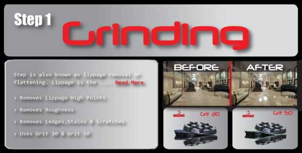 Irregular instalación o adaptación de los resultados de las bases en un piso desigual, este desigual se llama lippage. Con el tiempo rasguños son inevitables en un piso de mármol. Un nuevo piso de mármol puede tener llanura de piso debido a problemas de mala instalación. Este paso elimina los salientes y rugosidades y llanura a suelos de mármol. Elimina los arañazos más profundos y manchas también. Para este tamaño de grano bajo 30 y 50 diamante pulir piso son eficaces.