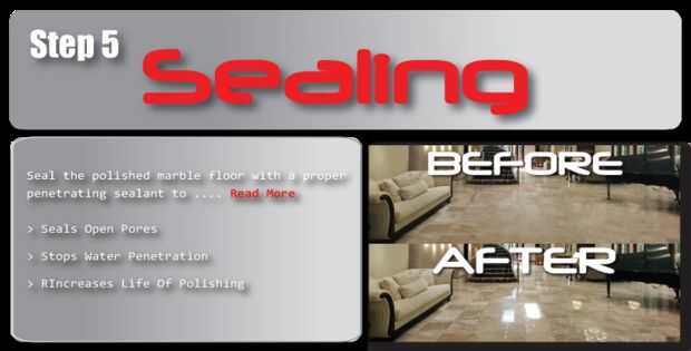 Sellado es la etapa final. Se extiende la vida de la planta mármol de grietas y astillas desde el principio sí mismo. Por lo tanto Aplique sellador mármol buena calidad por lo menos una vez al año.