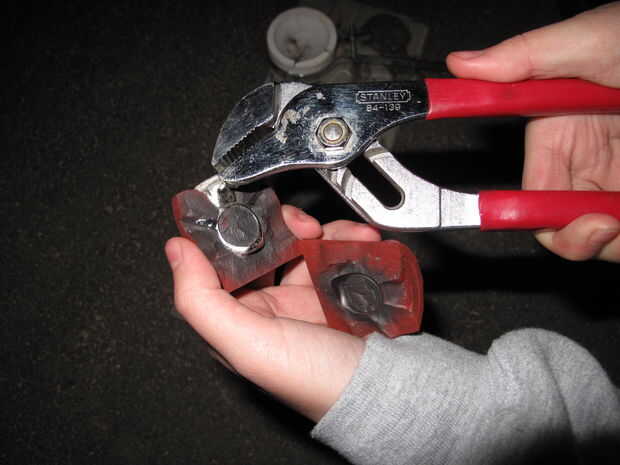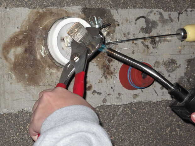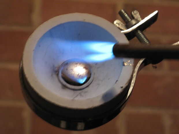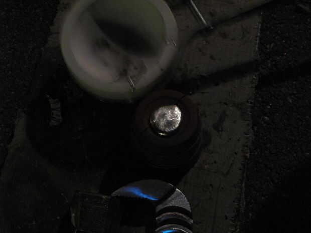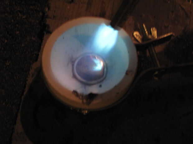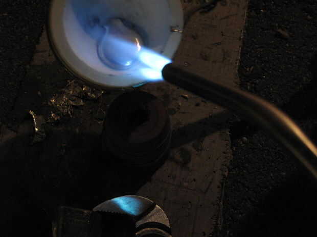 Si tienes el estaño en forma de lingote, vas a querer fundir de un poco de él en el crisol para que usted no tiene que derretirse el lingote entero cada vez que quieras un pequeño pedazo del molde (si está usando estaño shot, omitir este paso). Usé un par de pinzas de mango largo para sostener el lingote mientras que lo de fusión, pero no dude en hacer cualquier cosa que funcione para usted, siempre es seguro. Al hacer esto, trate de concentrar el calor de la antorcha en la parte inferior del lingote. Después de que usted piensa que tiene suficiente metal para conseguir un buen reparto, abajo el lingote y alicates y coloque la llama sobre el metal en el crisol.