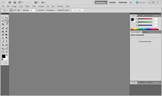 Estoy usando la versión de prueba de Photoshop CS5. También puede descargarlo en adobe.com. Debe tener un ID de Adobe para descargarlo. Instalarlo y abrirlo. Debe verse así: