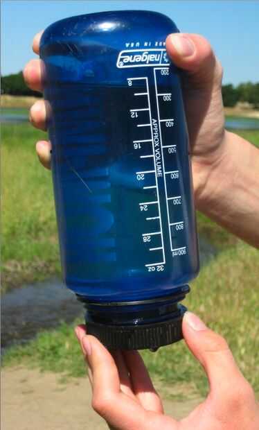 Después de cinco minutos, necesita purificar la boca y el borde de la botella (que toca la fuente de agua original y que toque la boca). Para ello, necesitará "thread" la botella. Coloque el botellón boca abajo y desenrósquelo lentamente la parte superior hasta que vea un anillo de agua alrededor del borde interior. Una vez que vea eso anillo de agua, usted sabe que el agua con el yodo se tocó la boca de la botella y lo desinfectado. Vuelva a enroscar la tapa y levante el lado derecho de la botella.